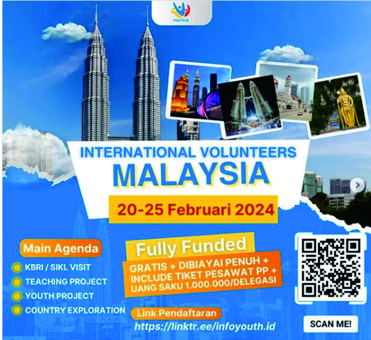 Program International Volunteer Malaysia 2024 diselenggarakan oleh Youth.id dan Semangat Muda Indonesia sebagai wadah bagi pemuda Indonesia untuk berkontribusi dalam kegiatan sukarela di Malaysia selama 20-25 Februari 2024. Terdapat tiga jenis jalur pendaftaran dalam program ini, yakni Fully Funded (beasiswa penuh), Special Funded (50%), dan Self-Funded (mandiri).